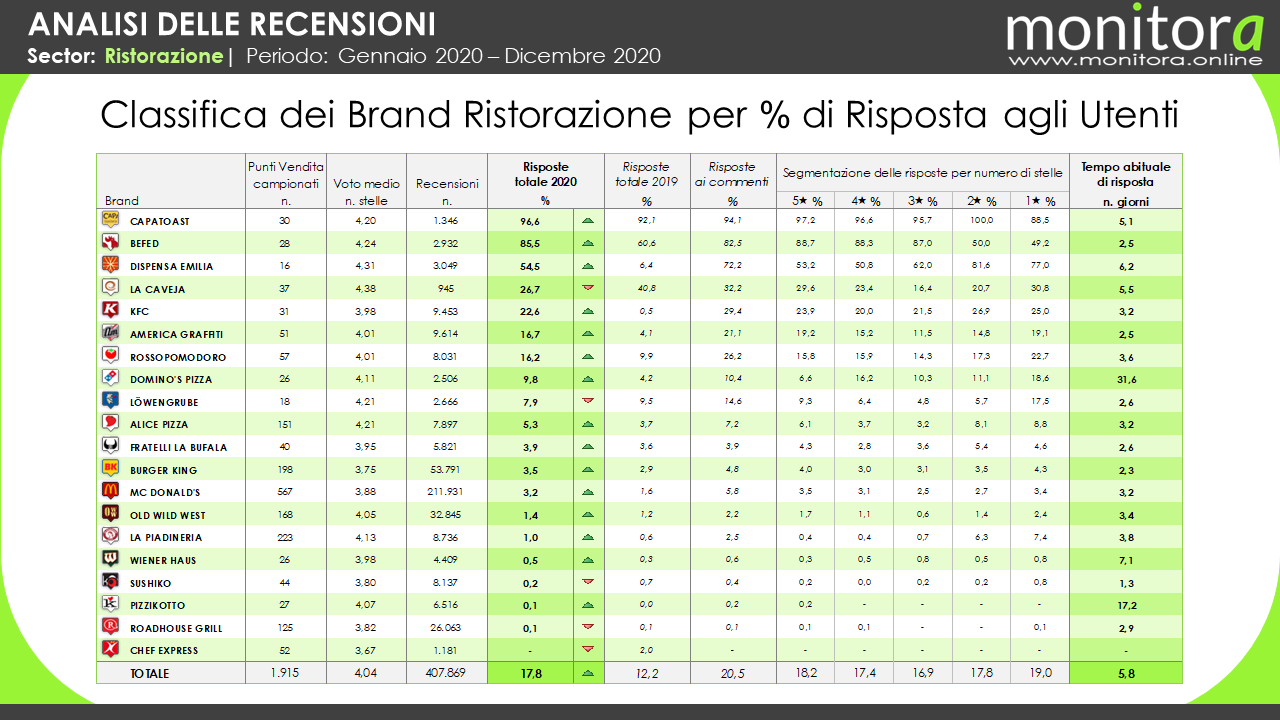 Classifica dei Brand Ristorazione per % di Risposta agli Utenti